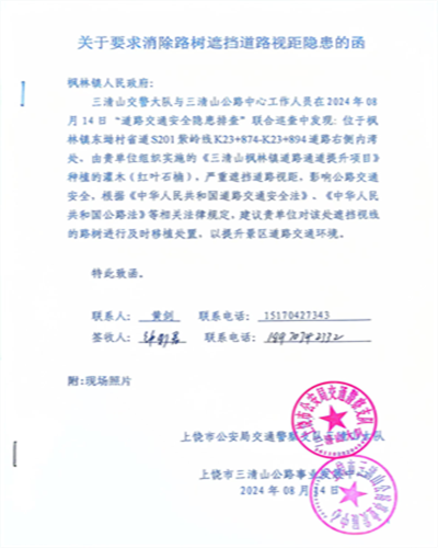联合巡查中发现,位于枫林镇东坳村省道S201紫岭线K23公里道路右侧内湾处,种植的红叶石楠灌木,严重遮挡道路视距,影响公路交通安全,根据《中华人民共和国道路交通安全法》、《中华人民共和国公路法》等相关法律规定,联合小组给相关单位发送及时处理的意见函。