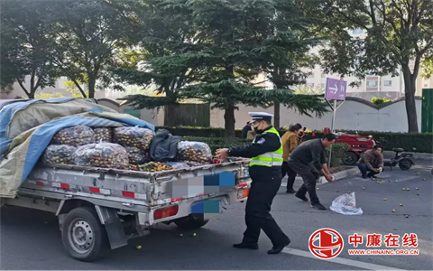 10月24日9时许,山西省长治市公安局潞城分局交警大队民警巡逻至辖区学府街与安华路北口时,发现一辆小型货车因捆扎不牢导致车上的大枣散落一地,过往车辆纷纷避让,存在极大交通安全隐患。