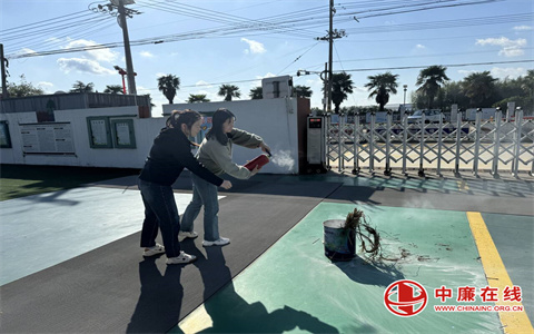 随后,安全员秦雁现场讲述了灭火器的正确使用方法和注意事项,并以身示范了基本的操作方法,教师按照“提、拔、握、压”四字口诀依次进行灭火器使用实操体验。理论结合实践,师生的消防疏散能力和灭火扑救能力再得提升。