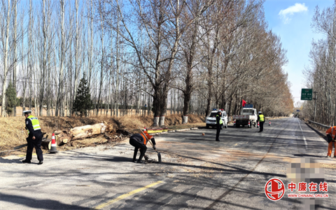 4月12日上午8时许,古之河中队民辅警在国道G336线430Km六合地加气站西方向巡逻时,发现一棵大树横卧在道路中央,严重阻碍车辆通行。见此情形,中队民辅警迅速联系公路段工作人员,并立即对过往车辆进行指挥疏导,引导车辆绕行。公路段人员抵达现场后,双方协同合作,全力清理路面断木。经过一个多小时的奋战,于9点15分成功清理完毕,道路恢复正常通行。