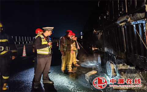 事发时,大队民警正在辖区开展夜间巡逻,发现该货车停在应急车道后轮冒出浓烟并伴有明火后,立即开启警灯警报,同时同步调度消防救援力量赶赴现场。在消防力量到达前,民警使用车载灭火器开展先期处置,有效控制火势蔓延。消防救援人员抵达后,迅速协同配合,铺设水带、架设水枪,对起火部位进行精准扑救。