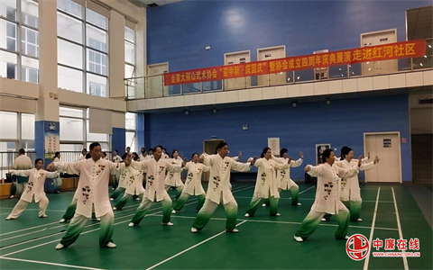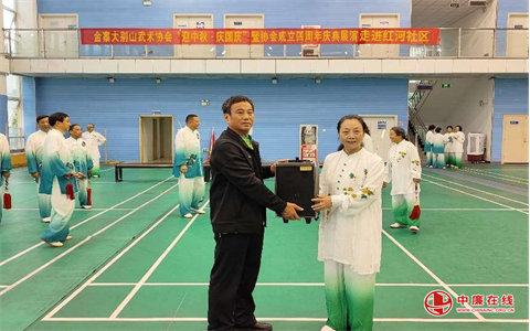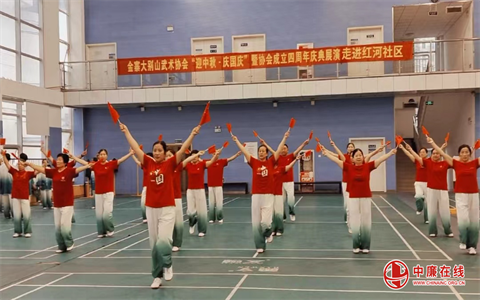 上午7:30分,庆祝活动正式开始。金寨县文旅体育局体育中心和红河社区负责同志发表了热情洋溢的讲话,安徽省社会体育指导员协会副会长、金寨县社会体育指导员协会会长邓国庆向大别山武术协会捐赠了音响设备,大别山武术协会会长袁红云详细介绍了活动筹备情况。接下来,会员们以饱满的热情在共同演唱《歌颂祖国》之后,举行了丰富多彩的才艺展演。