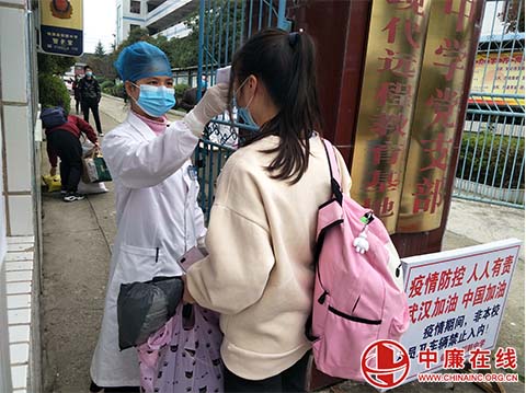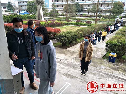 中廉在线3月17日讯:又是一年开学季。3月16日,在贵州省锦屏县铜鼓镇中学校园门口,学生正在有序测量体温、酒精消毒等。测量体温正常、填写信息后方可进入校园。