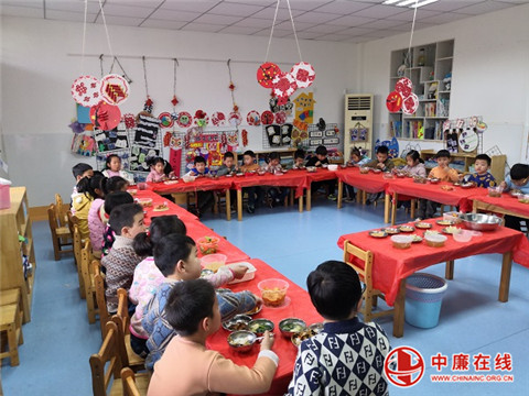 午餐时间,孩子们拿出了爸爸妈妈事先准备好的拿手好菜和小朋友一起分享,自主用餐,愉快的用餐过程中,花灯笑脸相互交映,映出节日里大家愉悦的心情。