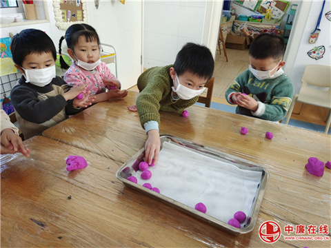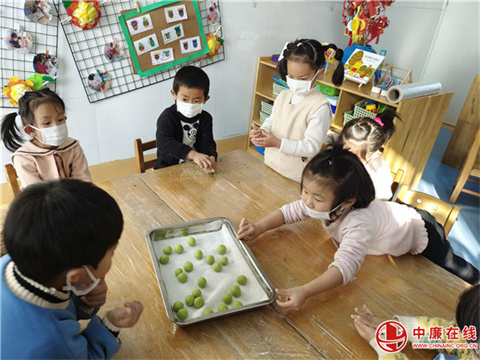 元宵节系列活动的重头戏“庆元宵、做汤圆”体验活动开始了,中班的孩子们在老师的带领下,挽好袖,捏起面团揉一揉,压一压,放上馅,团一团,搓一搓。不一会儿,一枚枚各种馅儿的五彩元宵就从孩子们的手里诞生了。虽然造型各异,大小不一,但孩子们都乐在其中。