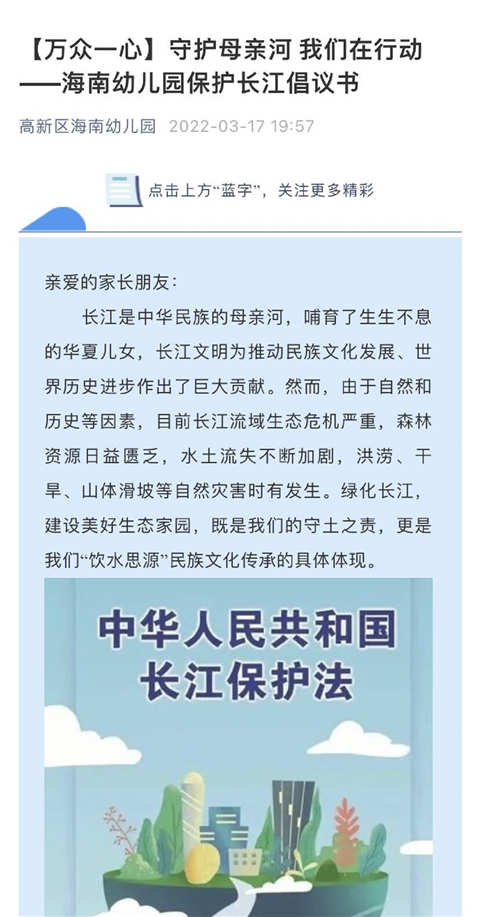 学习结束,幼儿园通过公众号、班级群向家长宣传《中华人民共和国长江保护法》,让大家知晓共同守卫母亲河的必要性和迫切性,呼吁大家行动起来,守卫母亲河,守卫我们共同的家园。