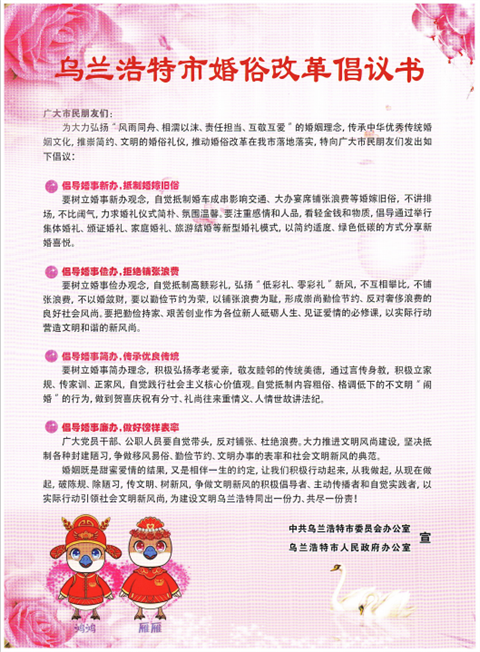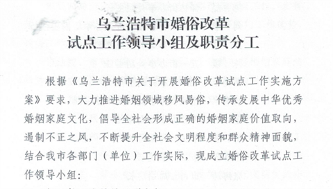 婚俗改革的有效开展,离不开兴安盟民政局的大力支持,离不开乌兰浩特市委、政府的坚强领导,为夯实改革基础,乌兰浩特市成立婚俗改革工作领导小组,先后出台了《婚俗改革试点工作实施方案》《关于成立乌兰浩特市婚姻家庭纠纷人民调解委员会的通知》等一系列规范文件。制作“婚俗改革五大类台账”“婚俗改革活动计划表”,发布《乌兰浩特市婚俗改革倡议书》,坚持以系统化,制度化、规范化、有序化方式推进婚俗改革工作。召开婚俗改革相关研讨、部署推进、专题汇报等会议48次。