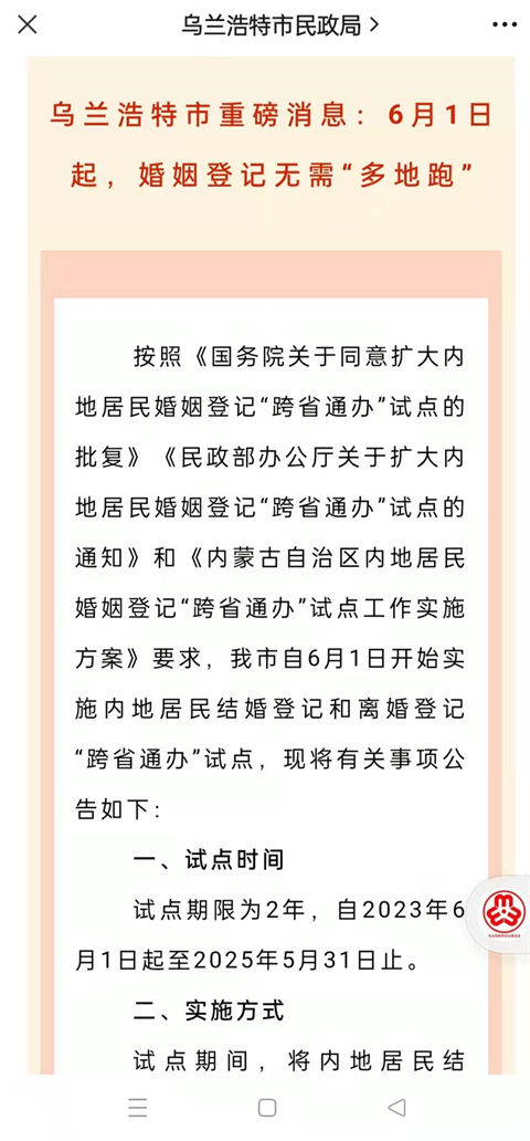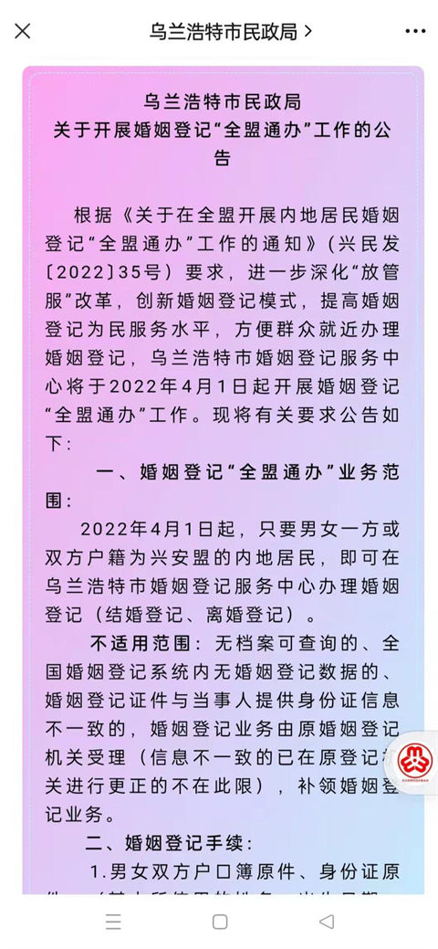 完成1998年至今全部117730份婚姻登记档案电子化录入工作,夯实婚姻登记查询管理的数据基础。先后开展婚姻登记“全盟通办”,“跨省通办”,实现婚姻登记“地域自由”。实现蒙速办App婚姻登记电子证照在线查询下载,婚姻登记服务更加便捷高效,实现以数字服务加码,为新人幸福减负。