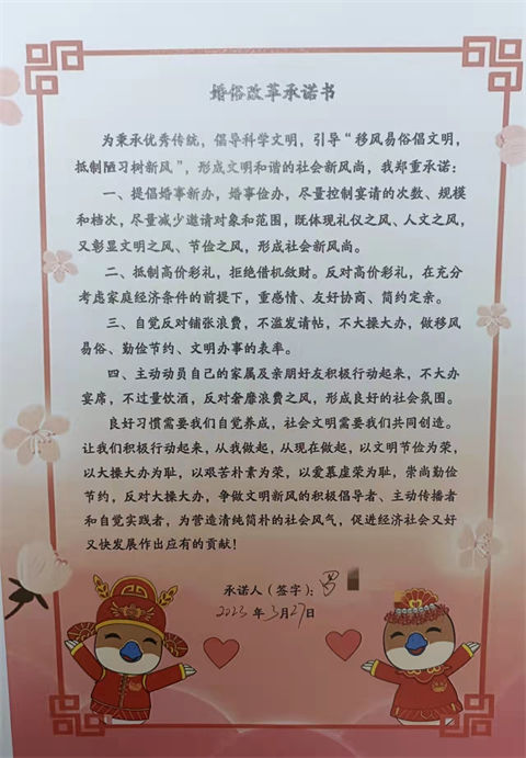 5对新人共同诵读《婚俗改革承诺书》,在倡导文明婚俗承诺书上签名