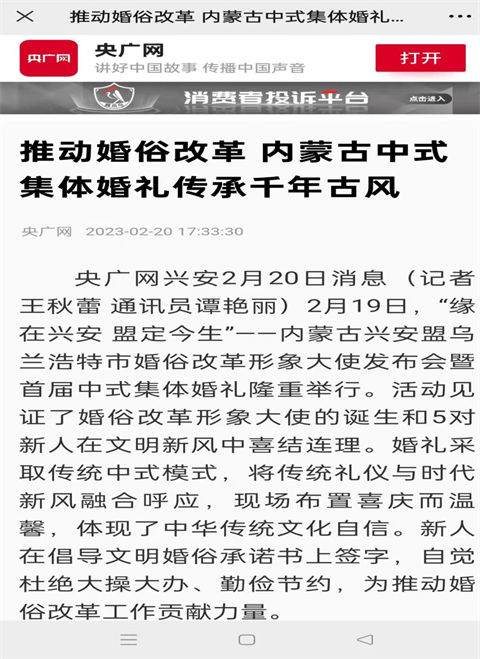 2月19日,“缘在兴安 盟定今生”——乌兰浩特市婚俗改革形象大使发布会暨首届中式集体婚礼隆重举行。活动见证了婚俗改革形象大使的诞生和5对新人在文明新风中喜结连理。 婚礼采取传统中式模式,将传统礼仪与时代新风融合呼应,现场布置喜庆而温馨, 体现了中华传统文化自信