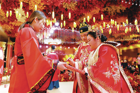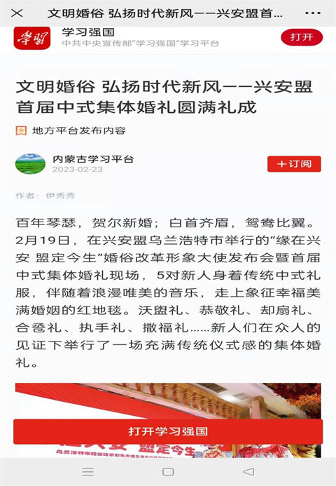 沃盥、恭敬、却扇、合卺、执手、撒福,体验庄重文雅的中式婚礼仪程,在仪式中感受婚姻的重量,用文明抵制恶俗;拥抱携手走过50年风雨的父母,聆听老一辈对于婚姻和爱情的朴实讲述,感受家庭的分量,用陪伴见证爱情;打卡红色革命场馆、合唱爱国歌曲,在功勋老兵的见证下因理想而结为伴侣,用朴素代替铺张。乌兰浩特市民政局用心谋划婚俗改革,不断创新婚俗改革活动载体,让广大群众在一场场婚事新办的过程中,适应新的婚俗文化,感受新的婚俗氛围,让群众在参与中转变观念,用个体的改变影响群体,共建共树新时代婚俗新风。