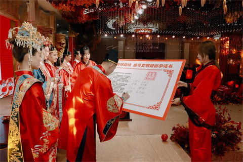 新人双方各执一印,款款落印。谨以白头之约,书香红笺,好将红叶之盟,载明鸳谱