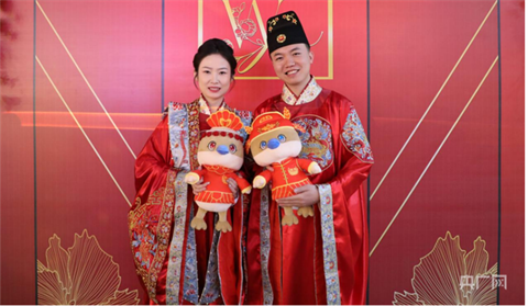 新人与乌兰浩特市婚俗改革形象大使“鸿鸿”“雁雁”玩偶合影留念