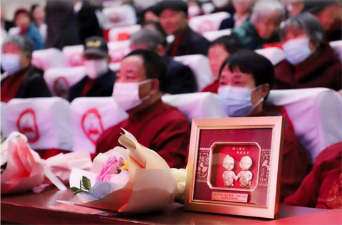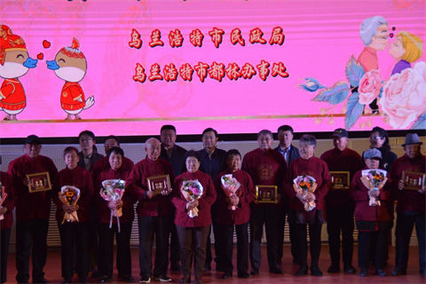 乌兰浩特市民政局为金婚老人送上金婚纪念相框,子女代表为老人送 上祝福鲜花。与会领导和金婚老人们一起分享代表幸福的蛋糕,全场歌舞飞扬,气氛浓厚