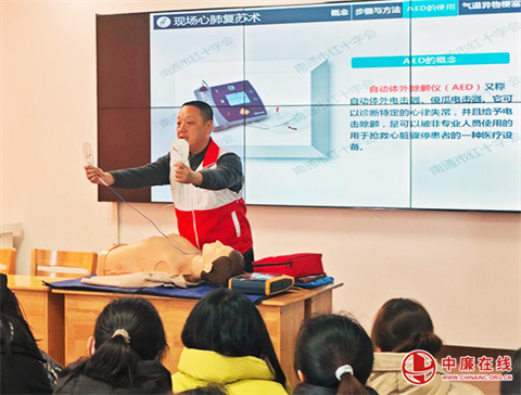 海安市红十字会的讲师崔建霞通过形象生动的图片、利用人体模型现场演示的方式帮助老师及家长了解了成人与幼儿心肺复苏、气道异物梗阻的应急救护知识。