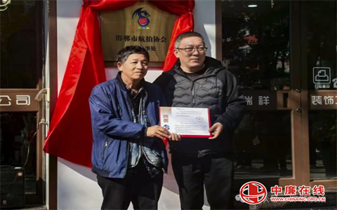 邯郸市航拍协会武安办事处主任李同宇与邯郸市航拍协会会长吕风献揭牌