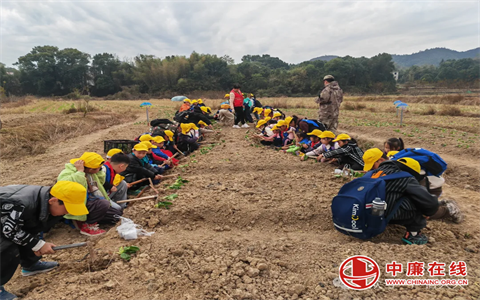 近日,在江西省上饶市广信区清水乡墩底村,见墩底农场两旁彩旗飘扬,在群山环绕中一片广袤平坦的实践基地上赫然插着“墩底村劳动实践基地”几个红色大字,种着白菜的土地上插着某学校某班级认领种植的牌子,在民俗体验区内,有梅花形灶台、实践桌椅,种着茶叶、粽叶,还有一个小房间专门放着各种实践道具。