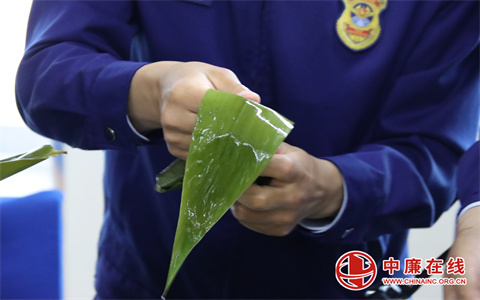 参观结束后,一场别开生面的包粽子活动在营区食堂热闹开场。桌上整齐摆放着糯米、粽叶、红枣、绳子等包粽子的材料,指战员和街道办工作人员围聚在一起,互相交流包粽子的技巧。经验丰富的街道办工作人员手把手教指战员折粽叶、填糯米、放馅料、扎绳子,大家一边包粽子,一边分享生活趣事,现场充满欢声笑语。有的指战员虽然是第一次包粽子,动作略显生疏,但在工作人员的耐心指导下,也逐渐掌握了窍门,一个个形态各异的粽子在大家手中诞生。粽叶的清香与欢乐的氛围交织在一起,传递着浓浓的情谊。