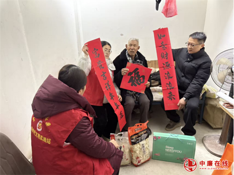 活动现场,志愿者们带着精心准备的慰问品,包括米面粮油、生活用品以及饱含新春寓意的春联、“福”字,走进孤寡老人的家中。志愿者们与老人亲切交谈,仔细询问老人的生活状况和身体情况,倾听老人的心声与需求,用真诚的陪伴驱散老人的孤独。同时,志愿者们还为老人送上春联、“福”字,将浓浓的年味与美好的新春祝愿送到老人身边,让老人提前感受到春节的喜庆氛围。