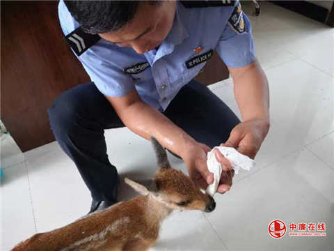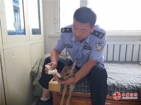 7月7日上午,黑龙江省林区公安局通北分局群力派出所接到求助电话,通讯公司架设线路的工作人员在作业时遇到一只野生狍子。民警立即驱车赶往现场,当看到狍子的一瞬间,心就立刻被它的呆萌给融化了,可可爱爱的它还安静配合民警的救助。