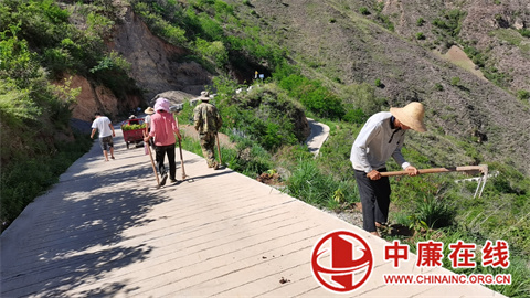 植树活动现场,大家热情高涨、干劲十足,组织有序,分成四组,分工合作,分别在马家湾组、林口组、白沙沟组种植侧柏,豆腐沟组种植芒果。参与植树的人员卸苗、松土、打塘、扶苗、培土、踩实、浇水,衔接有序,配合默契,各项工序有条不紊,呈现一派热火朝天的劳动景象。