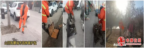 中心园林股出动吸尘车1辆、清运车2辆、园林工人8人对主要路段绿化带内枯枝杂叶与漂浮物,以及各辅路段周边杂草枯草进行了逐个检点与清理。(宗飞 闫乾易)