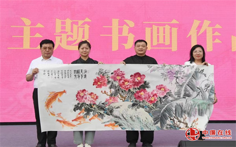推介会上,雷成才、武艳花代表汾阳市上台接受“汾清天下”主题书画作品——牡丹图。