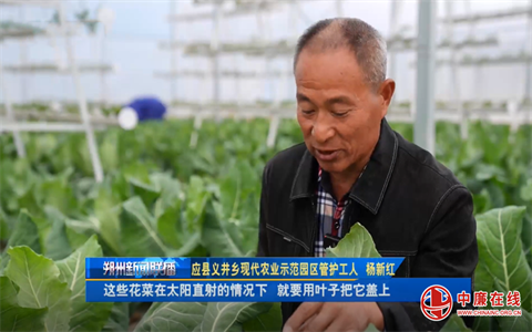 应县义井乡现代农业示范园区管护工人杨新红介绍,这些花菜在太阳直射的情况下,就要用叶子把它盖上,太阳不能直射,直射了以后颜色就变了,发黄了。平时温度最高20—22摄氏度最好,再不能太高。长到2斤左右就可以采收。