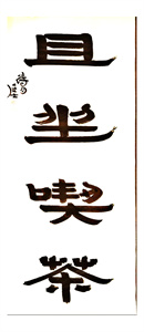 在结构处理上,正建居士坚持“因字立形”,既保持隶书“宽博端庄”的本质,又适应竖式布局的纵向张力。“且”字笔画简约,处理为“上紧下松”形态,竖画劲挺强化纵向支撑,如禅师跏趺,稳坐蒲团;“坐”字对称中求变化,左侧“人”字略收、右侧略放,中间“土”字竖画贯穿,稳定重心又显灵动,暗喻“不二法门”中蕴含的活泼机趣;“喫”字采用“左收右放”原则,收缩横向跨度、延伸纵向笔画,避免字形臃肿,犹如禅者用功,收摄六根,专注一念;“茶”字以“艹”字头统领全局,中间“人”字撇捺舒展,下方“木”字竖画为中轴,形成“上宽中展下稳”的格局,契合“郁郁黄花,无非般若”的森罗万象皆归一心。四字在纵向排布中形成“宽-紧-繁-舒”的节奏变化,既统一协调又各显风姿,完美诠释了“疏可走马,密处不透风”的东方美学,更在墨象中完成了“从放下(且坐)到融入(喫茶)”的禅观历程。