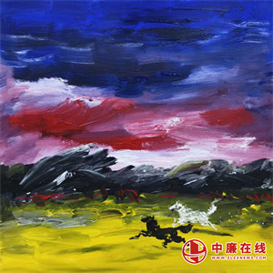 这幅《马踏天山》,早已超越了单纯的山水写生与动物描摹,成为一曲对西域大地的礼赞,对自由精神的歌颂。画面中,蓝天、霞光、群山、草原、骏马,共同构成了一个充满力量与生机的世界,既有北疆山水的雄奇壮阔,又有艺术家对生命本质的思考与对自由奔放精神的向往。观之,仿佛能置身于那片辽阔苍茫的西域大地,感受到天地的浩瀚与自身的渺小,在骏马奔腾的气势中,心中的郁结与束缚被一一驱散,只剩下对自由的向往与对生命的热爱。