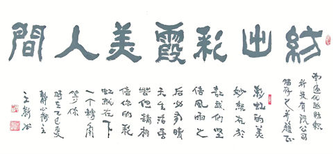 走进中国工商银行办公大楼,一幅毛主席的《沁园春·雪》映入眼帘,这便是蔡立新先生的隶书作品。他的隶书对联也曾在中国金融书法美术大赛中获奖,《别有洞天》等多幅作品被陕西省曲江文化长廊收藏并展出。蔡立新先生从长期浸淫汉碑的实践中获益甚多,能以篆意写隶,又佐以魏碑的气力,其风格自然独树一帜。