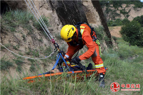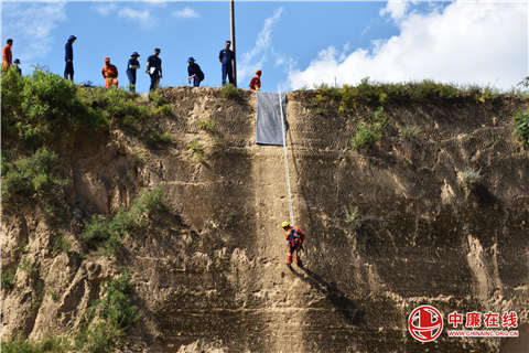 甘肃省森林消防总队西峰大队在庆阳市王家湾水库,模拟实战开展悬崖向上特种救援考核。(刘凯)摄