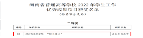 近日,经过学校推荐、河南省教育厅组织专家网络评审、专家评议等环节,郑州西亚斯学院寰宇住宿书院申报的教育导向型项目“院长荐文”通过层层筛选,入围2022年河南省普通高等学校学生工作优秀成果项目。