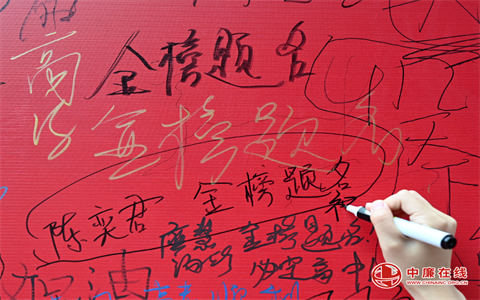 2023年6月7日,在四川省内江市第六中学考点,考生书写寄语预祝自己“金榜题名”。