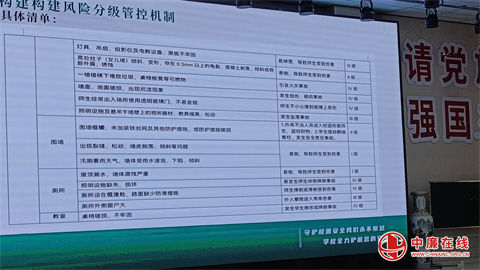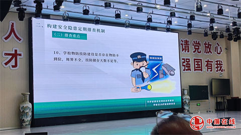 校园安全讲座。主讲人用ppt直观展示了校园安全的有关知识,如“双重预防机制”的相关内容,“隐患与风险的联系与区别” ,诠释了“隐患”与“风险”的概念和联系;“构建安全隐患定期排查机制”,排查重点如消防设施是否完善,应急逃生标志是否规范,灭火器材是否齐备,体育运动器材是否牢固,沙坑是否松软,篮球场地边缘是否有级差,篮球架是否牢固,学校食堂设施是否安全,食堂从业人员是否符合培训上岗要求,原材料验收、出入库管理是否规范,留样、消毒、环境卫生、加工烹饪是否安全管理到位,学校物防技防是否存在物防不到位、周界不全、技防储存天数不足,校园保安每天巡查校园重点部位不得少于5次,校园周边50米内不得摆摊设点,围墙高度不得低于1.4至1.6米,小学教室电灯距离课桌不得低于1.7米等;主讲人强调,家长与学校是平等地位的自然人,签订的有关安全协议,不能叫责任书,只能叫协议书。