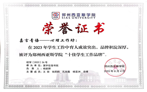 近日,郑州西亚斯学院发文,寰宇书院院长杨家卿教授获得“十佳学生工作者”,由他牵头负责的“嘉言青语——心理工作坊”获得“十佳学生工作品牌”称号,且是学校唯一“双十佳”获得者。