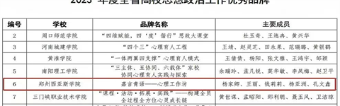 近日,2023年度全省高校思想政治工作奖评选结果揭晓,郑州西亚斯学院寰宇住宿书院院长杨家卿教授主持的“嘉言青语—心理工作坊”经学校推荐、专家评审、综合评议等环节,获批2023年度全省高校思想政治工作优秀品牌。