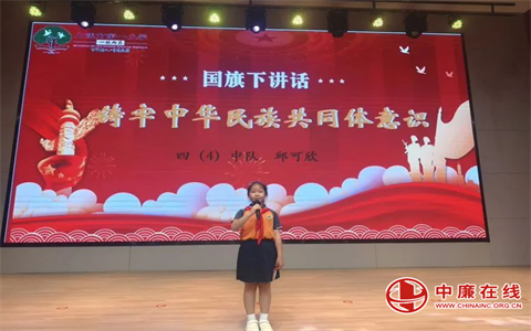 全体师生肃立,面向国旗,高唱国歌,心中充满了对祖国的热爱和对新学期国旗下,四(4)中队邱可欣同学的讲话让同学们认识到铸牢中华民族共同体意识的重要性。在新的学期里,全校师生要以铸牢中华民族共同体意识为主线,尊重不同民族的文化和习俗,增进民族之间的交流与融合,在校园里营造团结和谐的氛围,让每一位同学都感受到家的温暖。