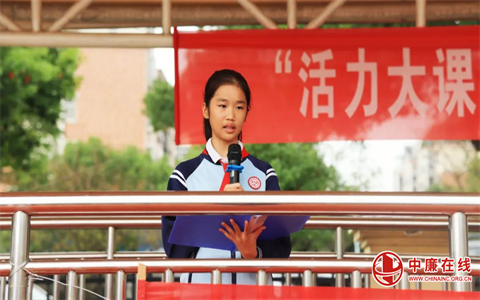 学生代表五(8)班姚焱清发言,她向同学们介绍学校大课间活动和阳光体育一小时的做法与好处。