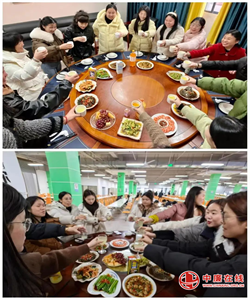 围坐在大圆桌旁的全体女性教职工们共享丰盛的菜肴,脸上洋溢着喜悦的笑容。桌上摆满了各式各样的美食,既有海鲜也有熟食、点心等中式料理元素,营造出欢乐和谐的氛围。每个人都在享受团聚的美好时光,相互交流分享故事,使得这张照片充满了感染力和生命力。