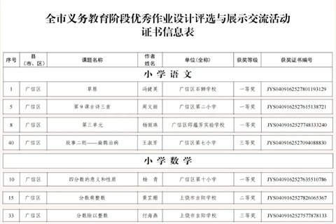 近日,在第五届全省中小学青年教师教学竞赛决赛江西省上饶市选拔赛中,广信区6名教师斩获3个一等奖,3个二等奖;在全市义务教育阶段优秀作业设计评选与展示交流活动中,广信区18名教师荣获6个一等奖,4个二等奖,8个三等奖。现予以通报表扬。具体名单如下: