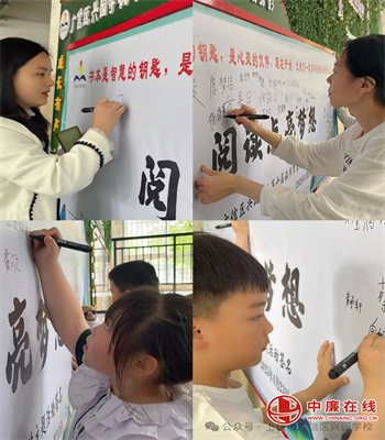 周海燕主席对本次校园读书节即将开展的活动进行了一一介绍,并带领全体师生在深情的朗读中感受“四时读书乐”。最后周主席宣布广信区兴园学校第十届校园读书节开幕! 随后,一年级全体师生在阅读倡议书上郑重地签下自己的名字,以笔墨为誓,共赴书香之约。