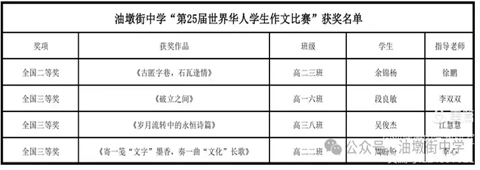 作为教育部认可的重要赛事之一,世界华人学生作文大赛始终以弘扬中华文化、提升中文写作水平、促进海内外学生文化交流为己任。本届大赛不仅为华人学生搭建了一个展示才华的广阔舞台,更充分体现了他们积极向上的精神风貌与扎实的中文素养。此次获奖,是油墩街中学语文教研团队深耕教学、不断探索的成果体现,也是油墩街中学立足文学教育、传承中华文脉育人理念的生动实践。