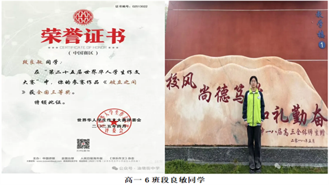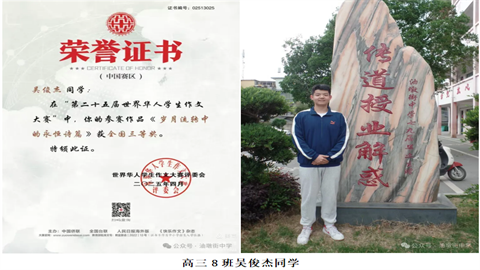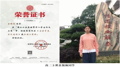 近日,第二十五届世界华人学生作文大赛的获奖名单正式公布。江西省上饶市鄱阳县油墩街中学学子们在此次大赛中表现出色。其中,高二3班的余锦杨同学荣获全国二等奖,而高一6班的段良敏、高三8班的吴俊杰以及高二2班的周盼盼三位同学则荣获全国三等奖。这一佳绩不仅展现了学校深厚的育人底蕴,更彰显了学子们良好的写作才能。同时,余锦杨等四位同学的指导教师以优秀的教学成果,被授予“优秀指导教师”称号。