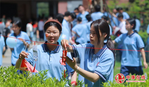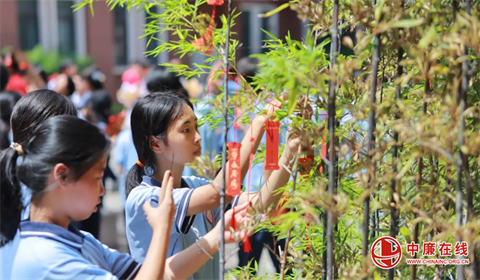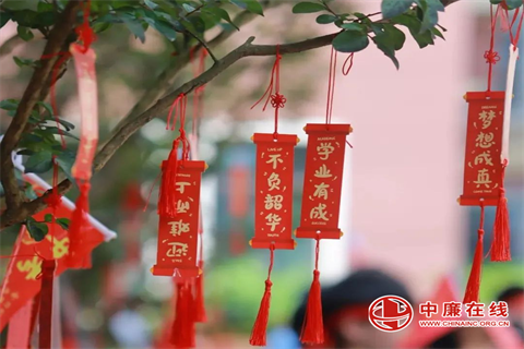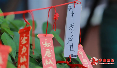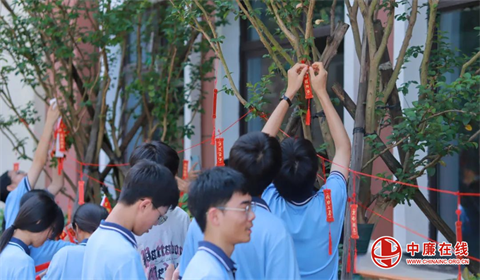 仪式接近尾声,温情在广场上流淌。九年级学子们手持鲜艳的中考加油旗,将写满梦想与期盼的红色祈福牌,亲手系在春华楼、夏耘楼下的葱郁枝头上。微风拂过,祈福牌轻轻摇曳,仿佛无数跃动的心愿,在母校的怀抱中静静生长,等待绽放。