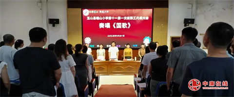 张柯副校长宣读《瑾山小学第十一届教职工代表资格审查报告》。会议在激昂的国歌声中拉开序幕,全体人员肃然而立。歌声如同一股磅礴力量,为会议注入了庄重而神圣的底色 。
