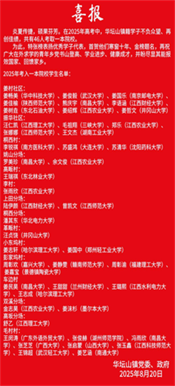 据悉,近年来,华坛山镇始终秉持“教育是最大的未来工程”理念,不断加大教育扶持力度,完善助学体系,致力为每一位学子铺就畅通的求学之路。截至目前,华坛山镇已通过“金秋助学”等多项教育保障机制,资助大批优秀学生继续学业,营造出崇文重教、文明和谐的乡村新风尚。(黎文强  黄宗振)