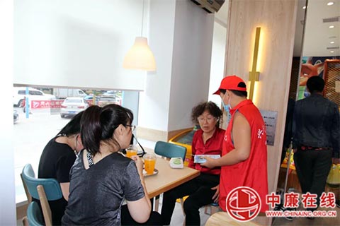 在麦德士、肯德基等餐饮企业,志愿者向用餐顾客发送市民文明手册的同时,并提醒顾客文明节俭用餐。志愿者还与餐饮企业店长共同在顾客点餐处张贴“勤俭节约”的宣传海报。