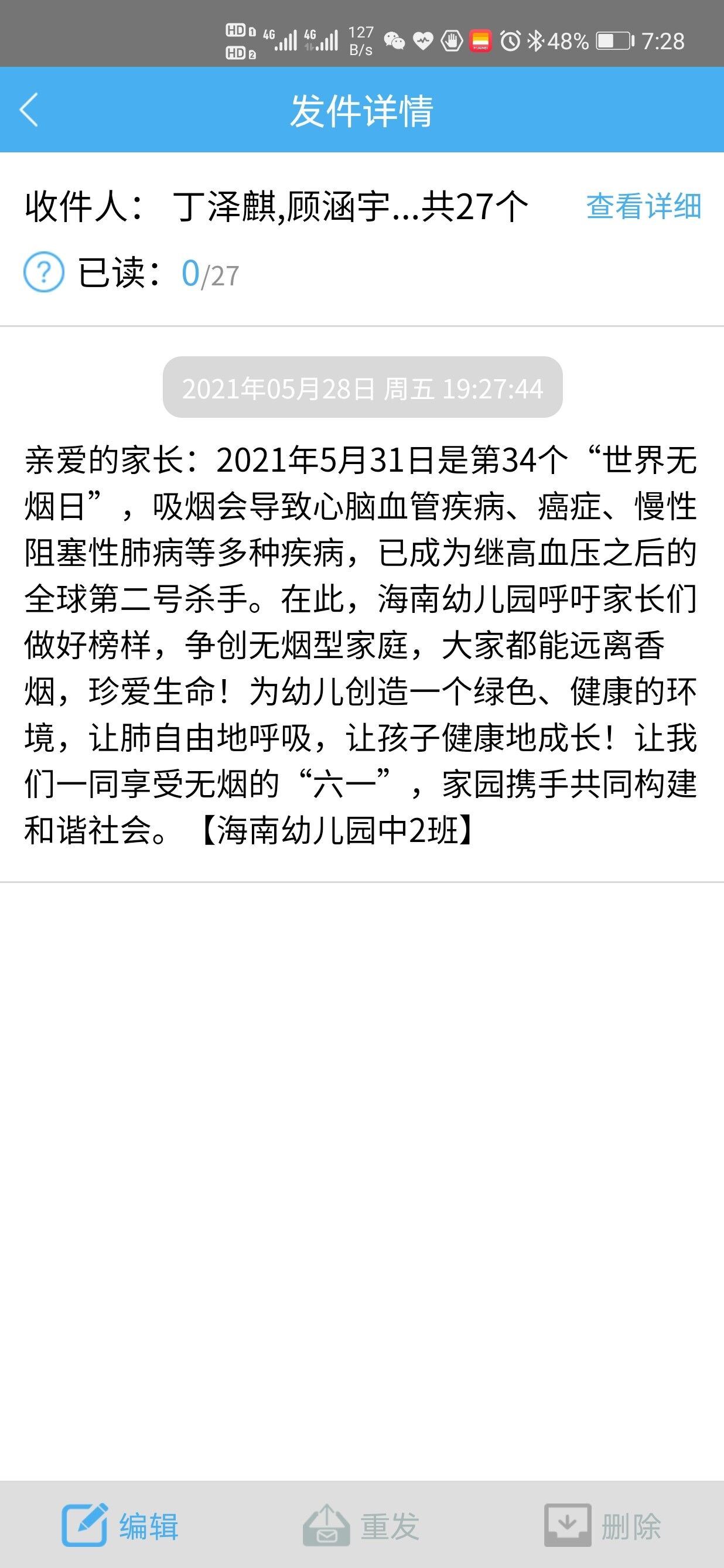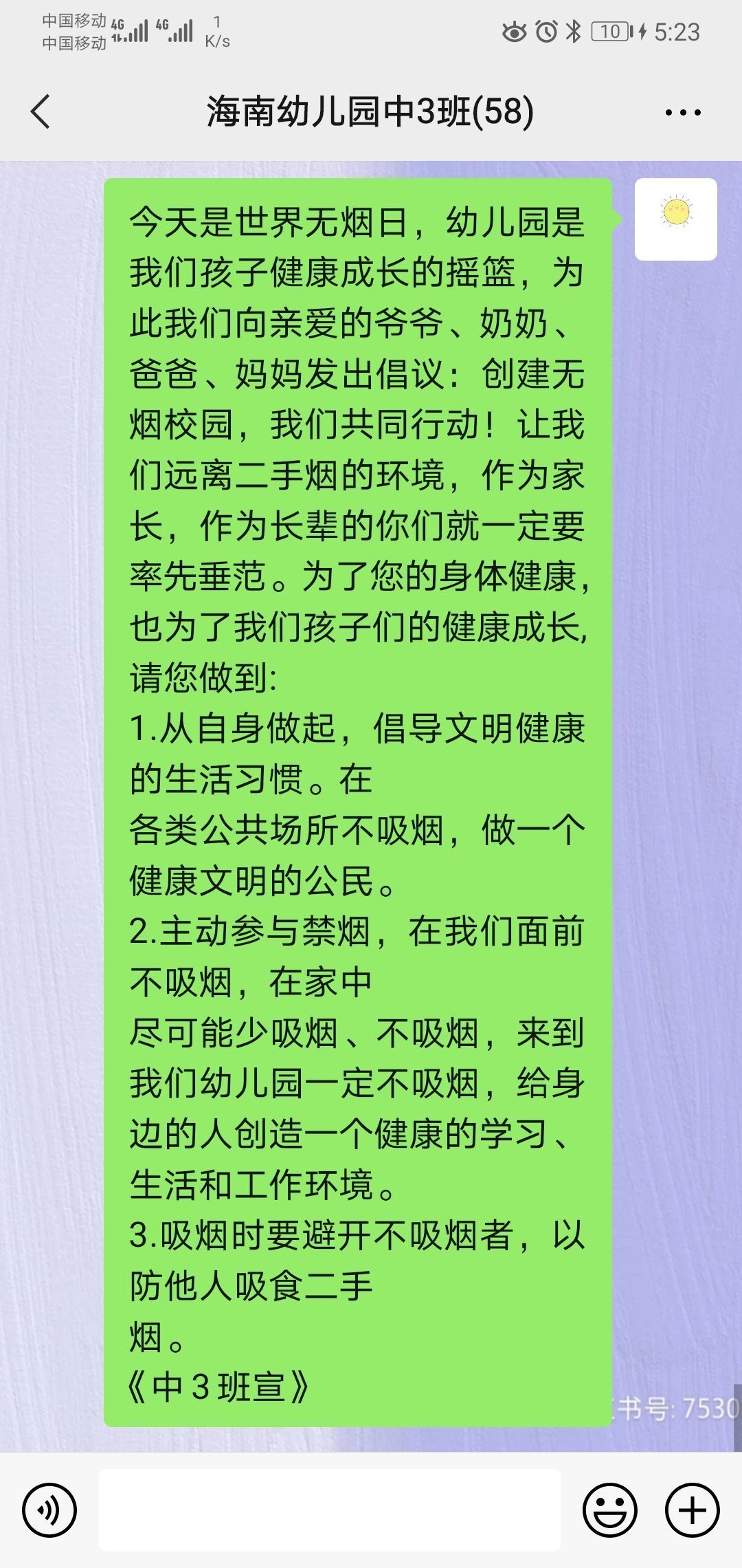 幼儿园还通过班级微信群、短信等形式对家长进行互动宣传,倡议“不要让我们的孩子吸二手烟”,为了让我们的下一代健康成长,请所有烟民少抽或不抽烟,不要让烟雾笼罩我们的孩子。让世界无烟日空气清新,相信远离烟草,一切美好都能如愿!家长们通过该宣传活动,也意识到了吸烟给自己和他人带来的危害,积极地加入到了禁烟队伍,争取戒烟,或者少吸烟,减少对身体的伤害。