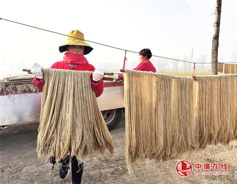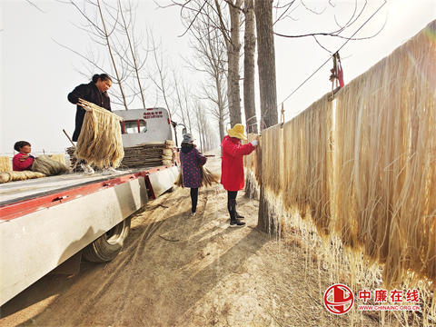瞧,农民从车上抱下一捆又一捆湿漉漉的粉条挂在凉绳上。晾晒粉条的场面热火朝天,道路两侧挂满粉条一字排开,远远望去犹如“十里长廊”,一派繁忙的新景象构画出一幅幅蒸蒸日上的美丽图画。